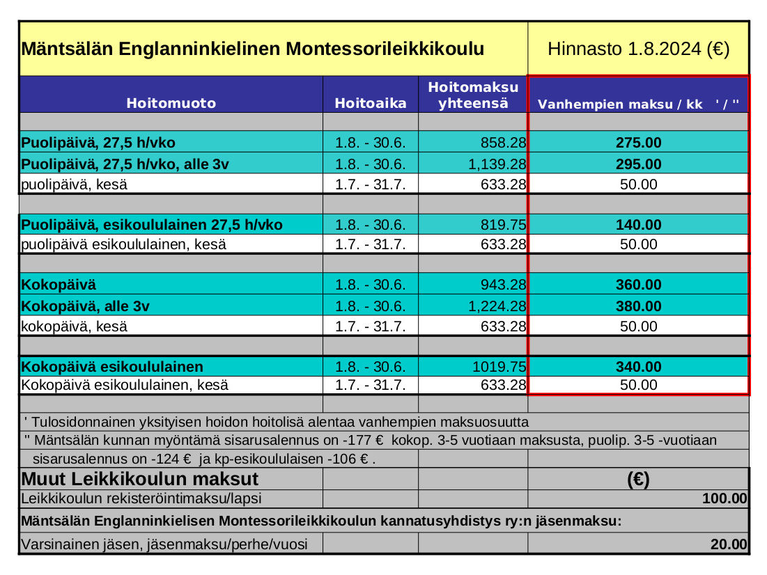 Leikkikoulumme englanninopetus on suunnattu suomenkielisille lapsille. Lapset tutustuvat englanninkieleen montessoripuuhissa, laulaen ja leikkien sekä arkipäivän toimissaan. Opettajamme puhuvat sekä englantia että suomea ja voivatkin auttaa lapsia oppimaan englantia heidän omaan tahtiinsa. Jos lapsella on paha mieli tai tilanne muuten on vaikea, käytämme aina lapsen äidinkieltä.